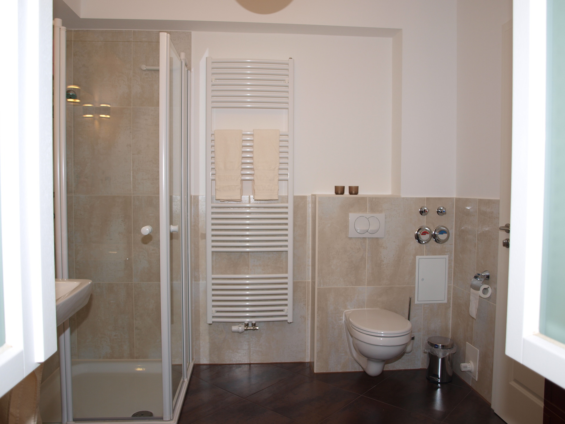 Im Badezimmer stehen für Sie zwei Wachtische, eine große Dusche, WC und ein geräumiger Badschrank zur Verfügung: