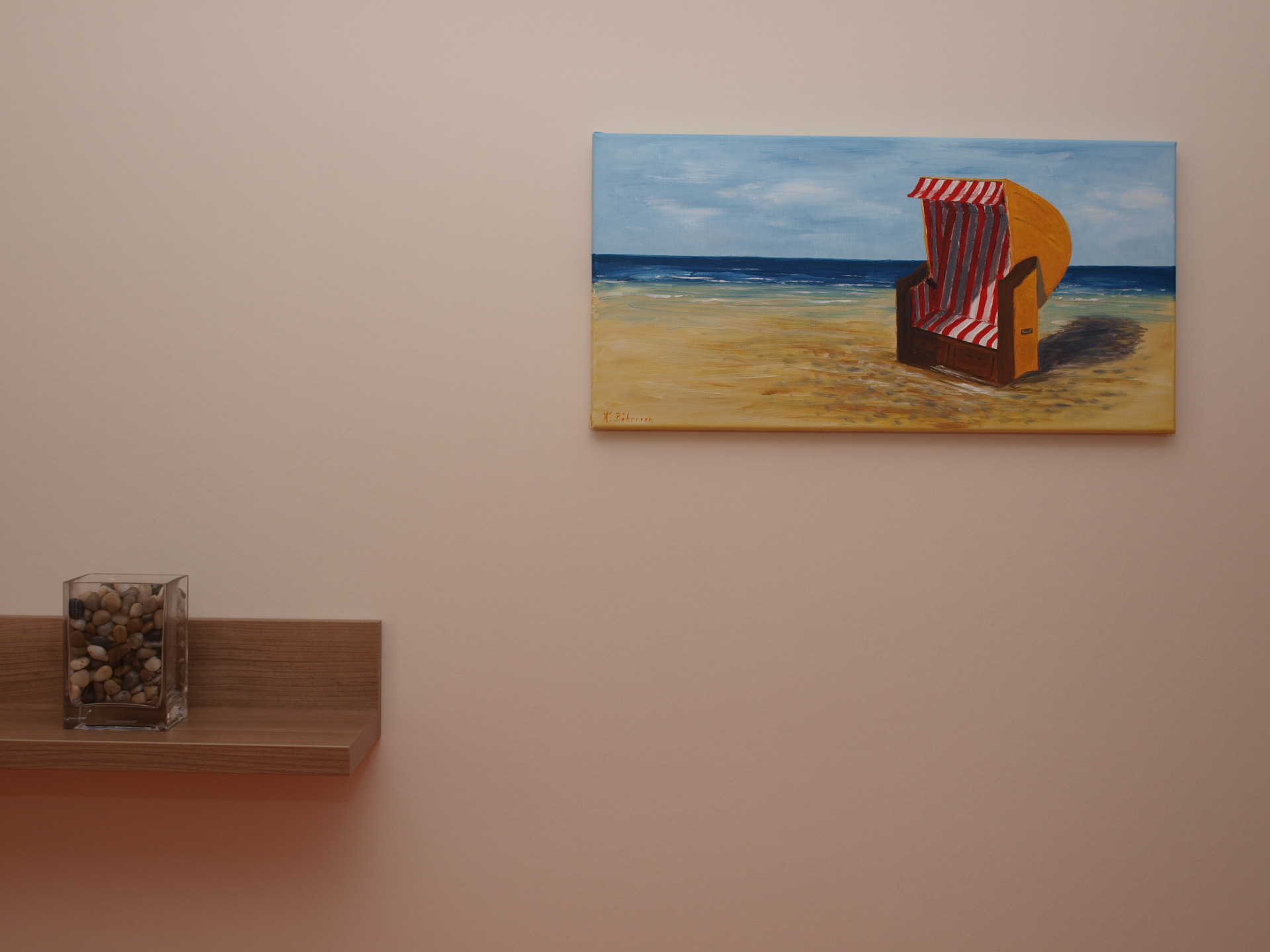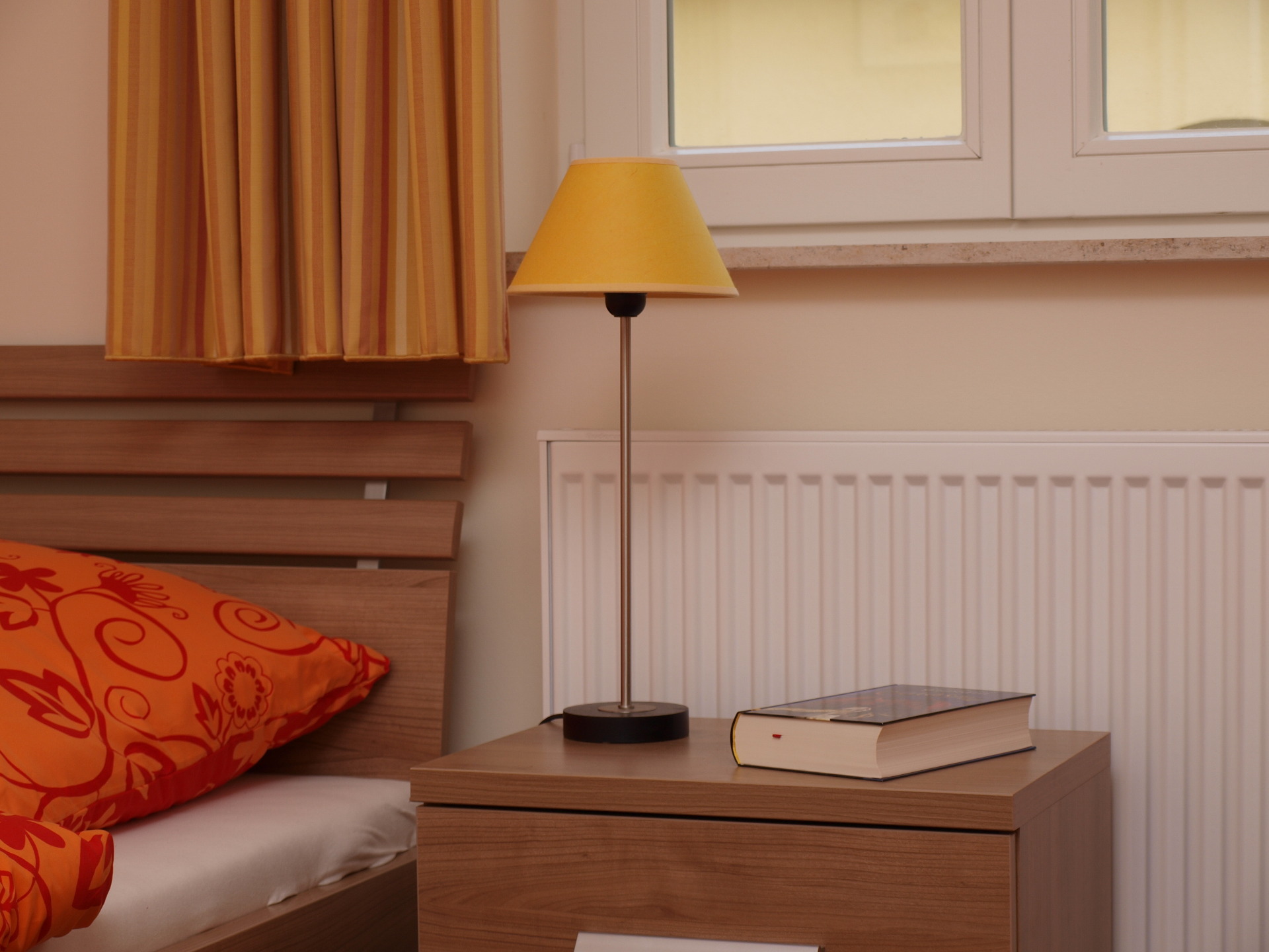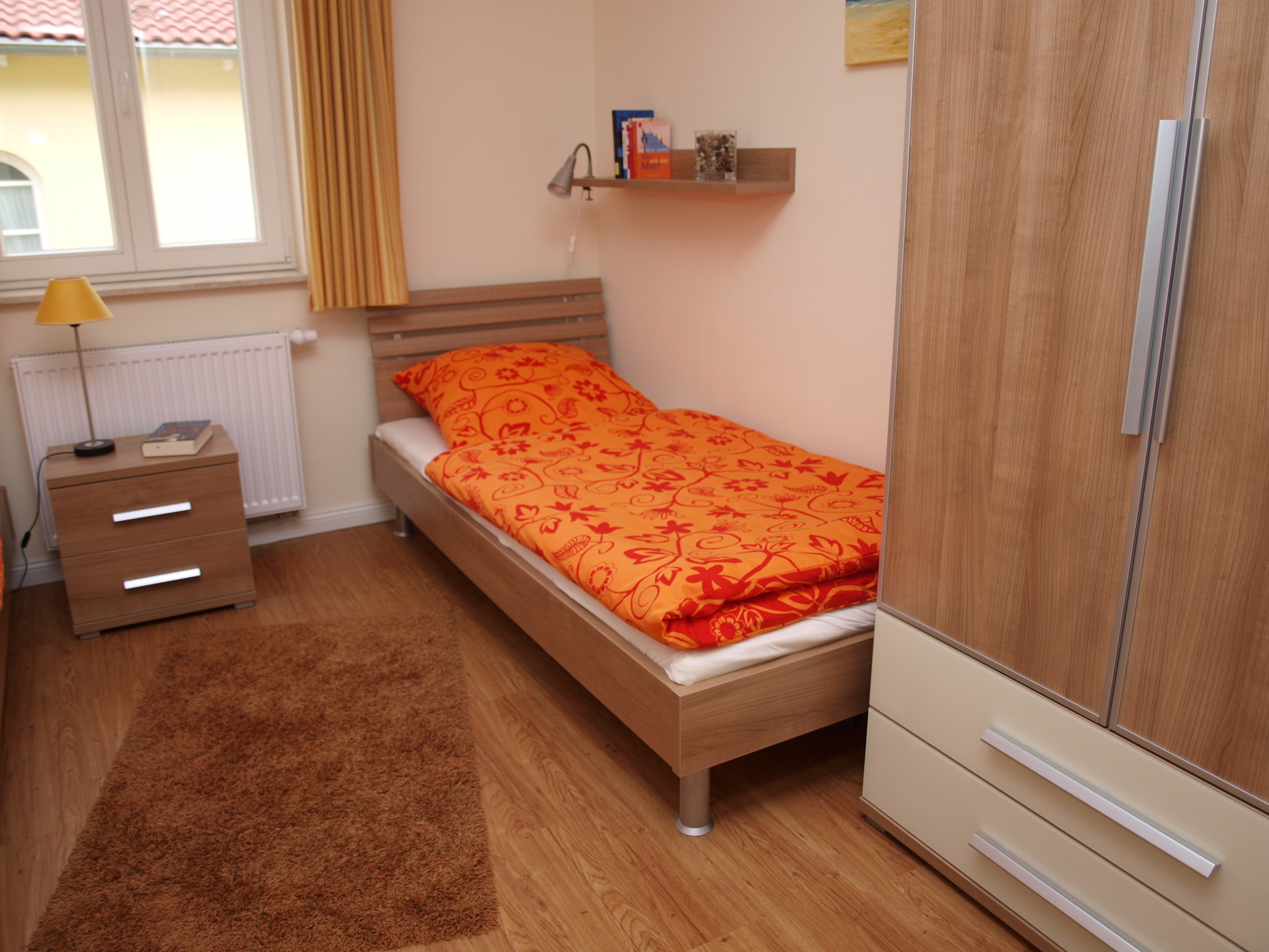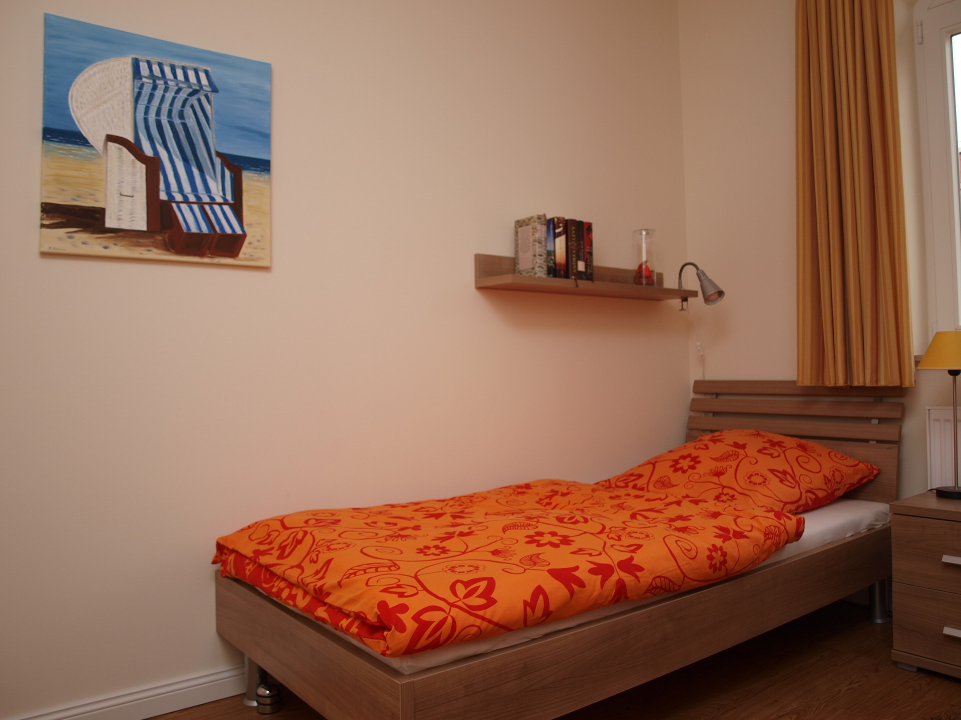 Das zweite Schlafzimmer kann sowohl als Kinderzimmer als auch dank der zwei Einzelbetten für zwei weitere Erwachsene genutzt werden. Ein großer Kleiderschrank, ein Nachttisch mit Leuchte, sowie je zwei Wandregale und Leselampen runden die Ausstattung ab und zusätzlich zu den Gardinen gibt es auch noch ein Abdunkelungsrollo.